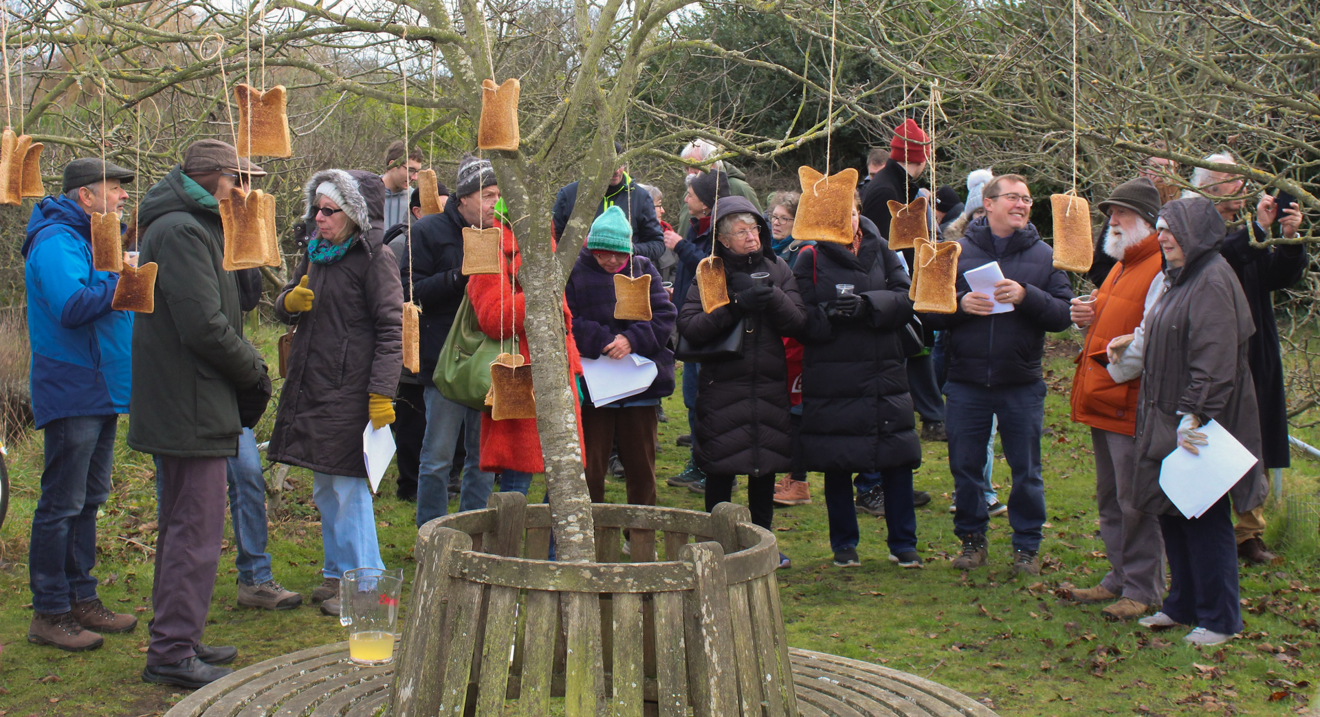 The purpose is to encourage the spirits into ensuring a good harvest the following season. It takes place on the twelfth night after Christmas and involves a visit to a nearby orchard for singing, dancing, drinking and general merrymaking.